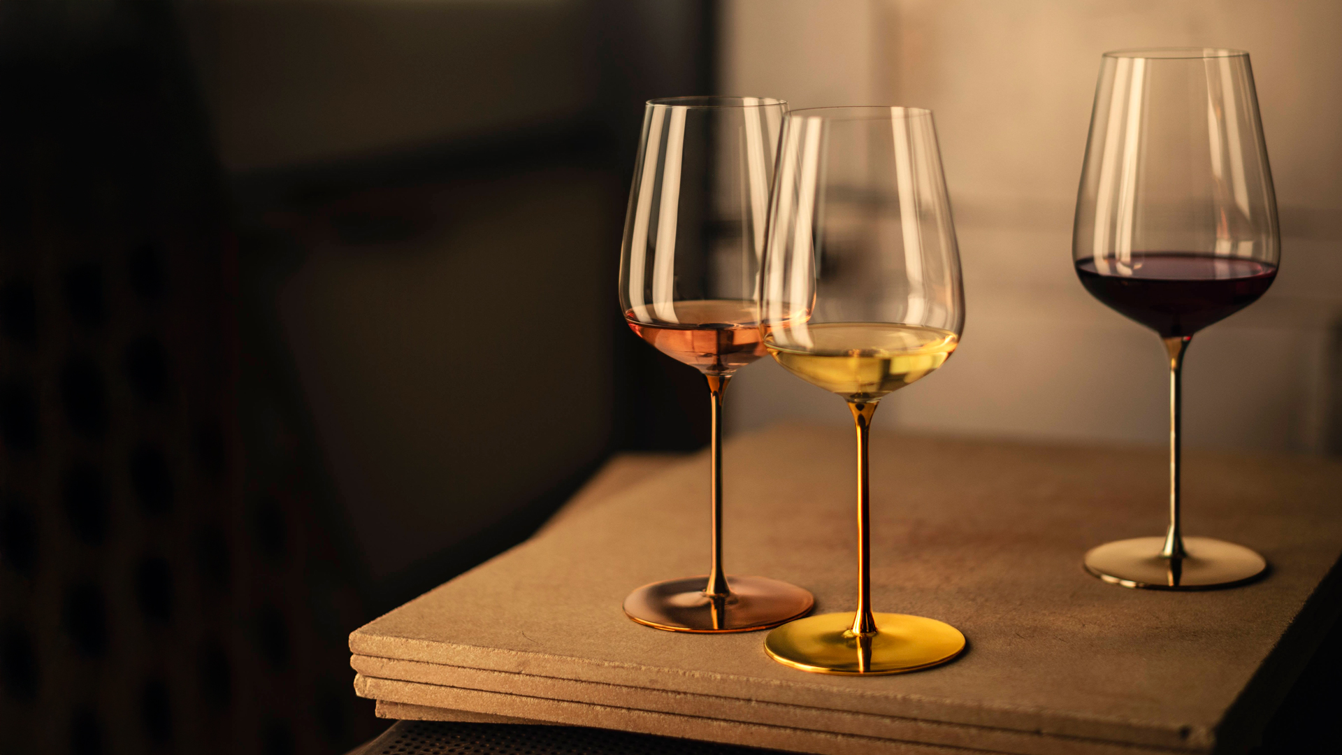 Drei Allround Weingläser, in den Veredelungswerkstätten der Glashütte Eisch in Handarbeit beschichtet mit echtem 24-karätigem Gold, Platin und Kupfer.
