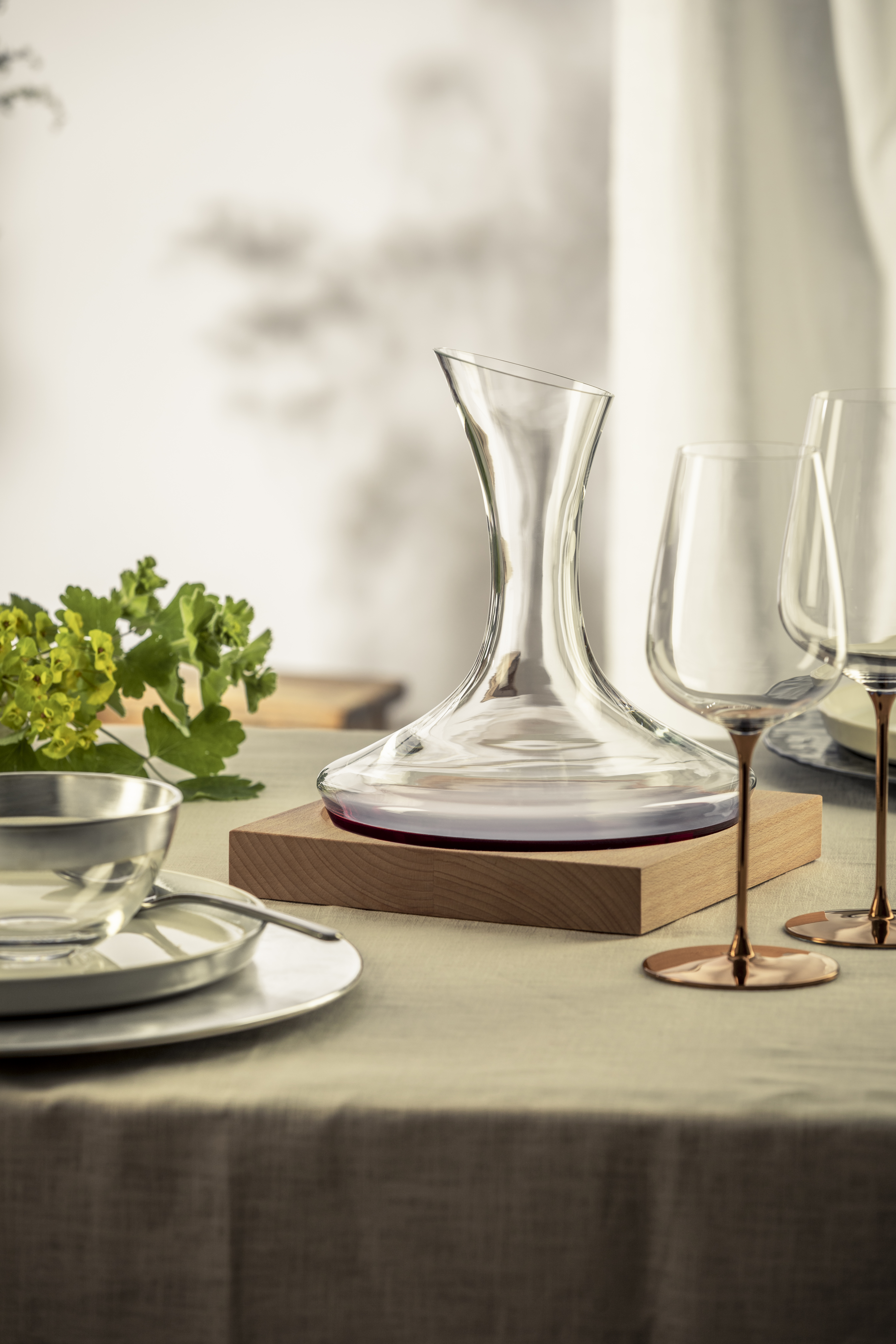 The decanter is mouth-blown from brilliant, lead-free crystal. Skill and fingertip feeling of the glassmaker merge with the individuality of the liquid glass, when the carafe is shaped.