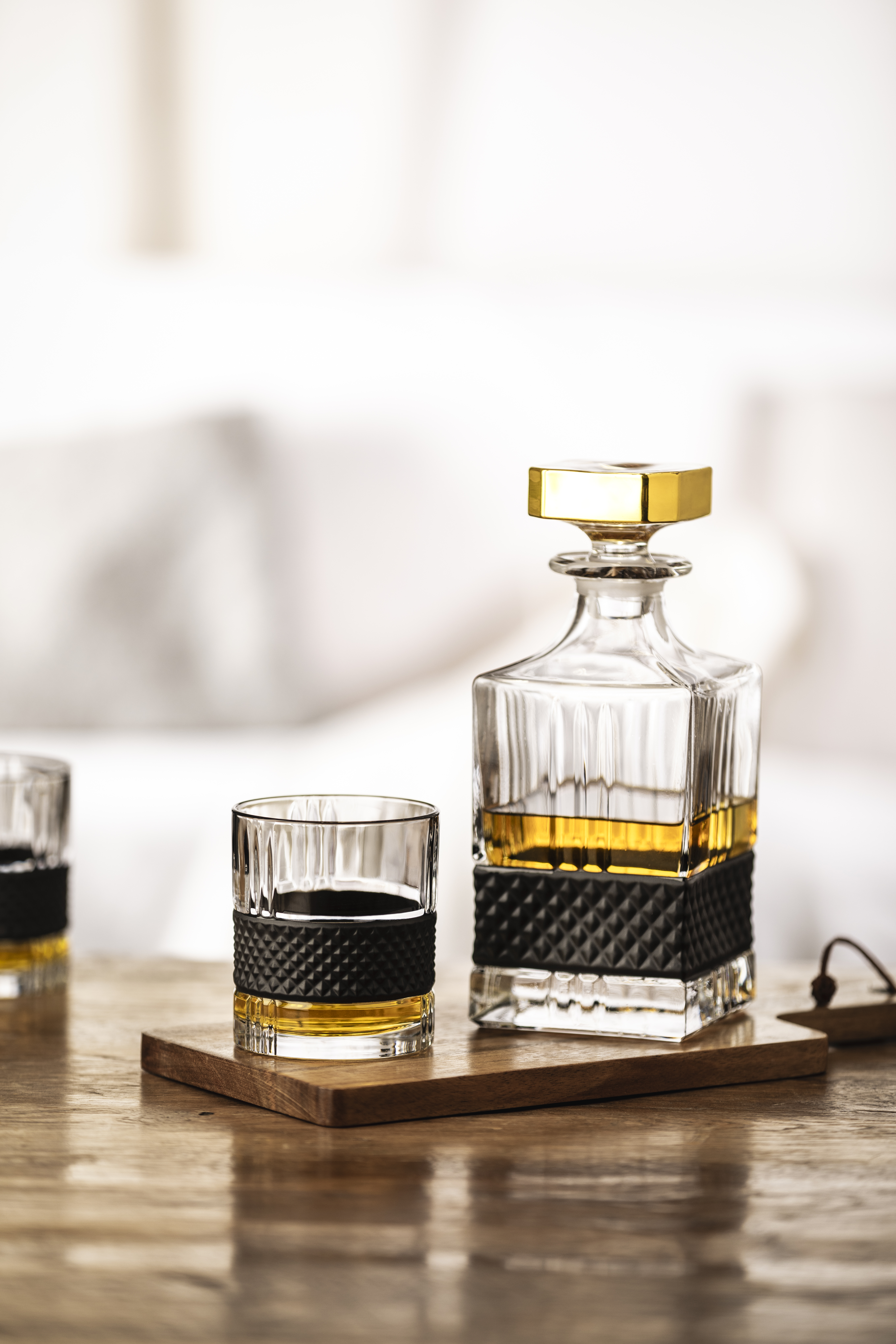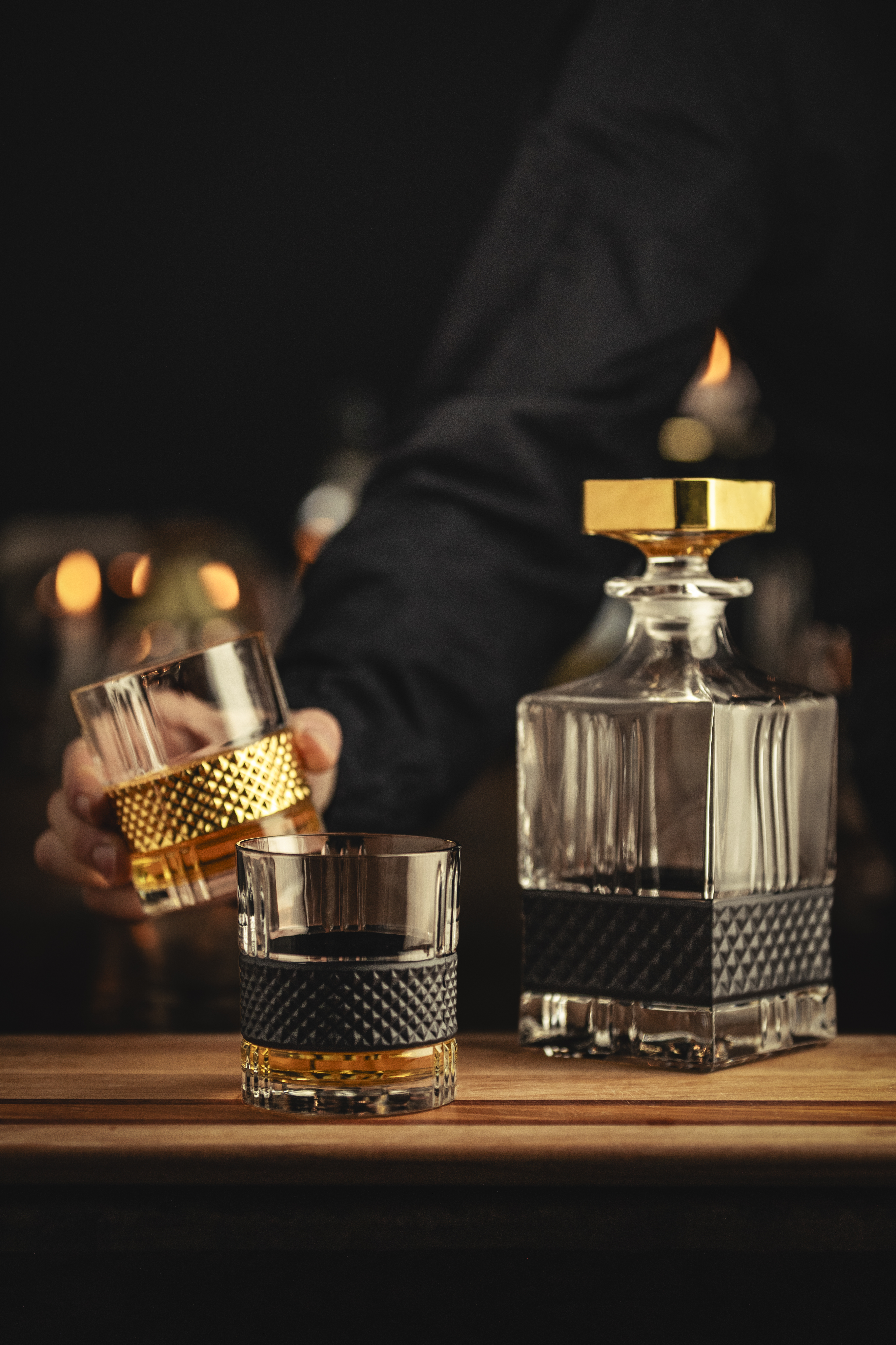 The EISCH GLEN whisky set in black and gold combines striking, graphic cut design with modern coolness and luxurious glamour. The square whisky decanter and two matching tumblers made of brilliant crystal glass are finished by hand with matt black and 24-carat gold in the finishing workshops of the EISCH glassworks. The interplay of timeless elegance and refined shine makes this set a real eye-catcher. The decanter (225 mm high, 850 ml volume) features the EISCH NO DROP EFFECT and guarantees clean, drip-free pouring. The set is stylishly packaged in a black gift box – an exceptional gift idea for whisky lovers and anyone who appreciates fine glassware for festive occasions.